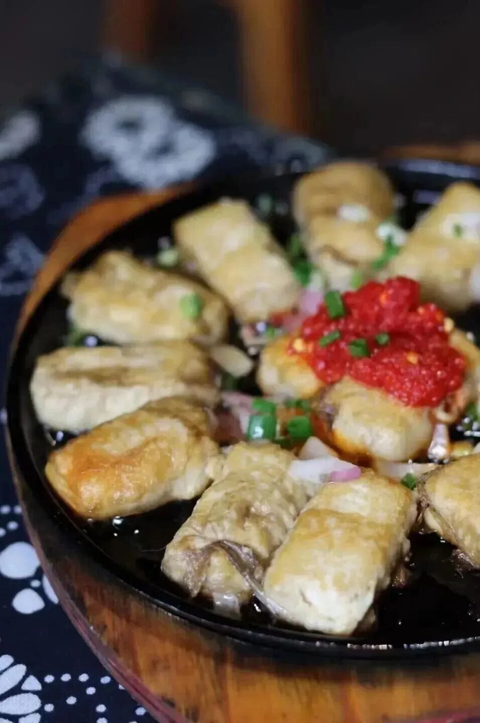 毛豆腐还可以入锅煎炸,那层茸毛会渐渐褪去,再蘸上自制的辣椒酱和葱蒜,比一般的豆腐更为丝滑软糯。