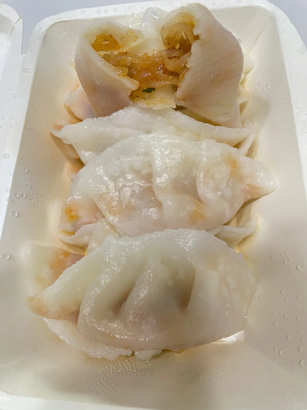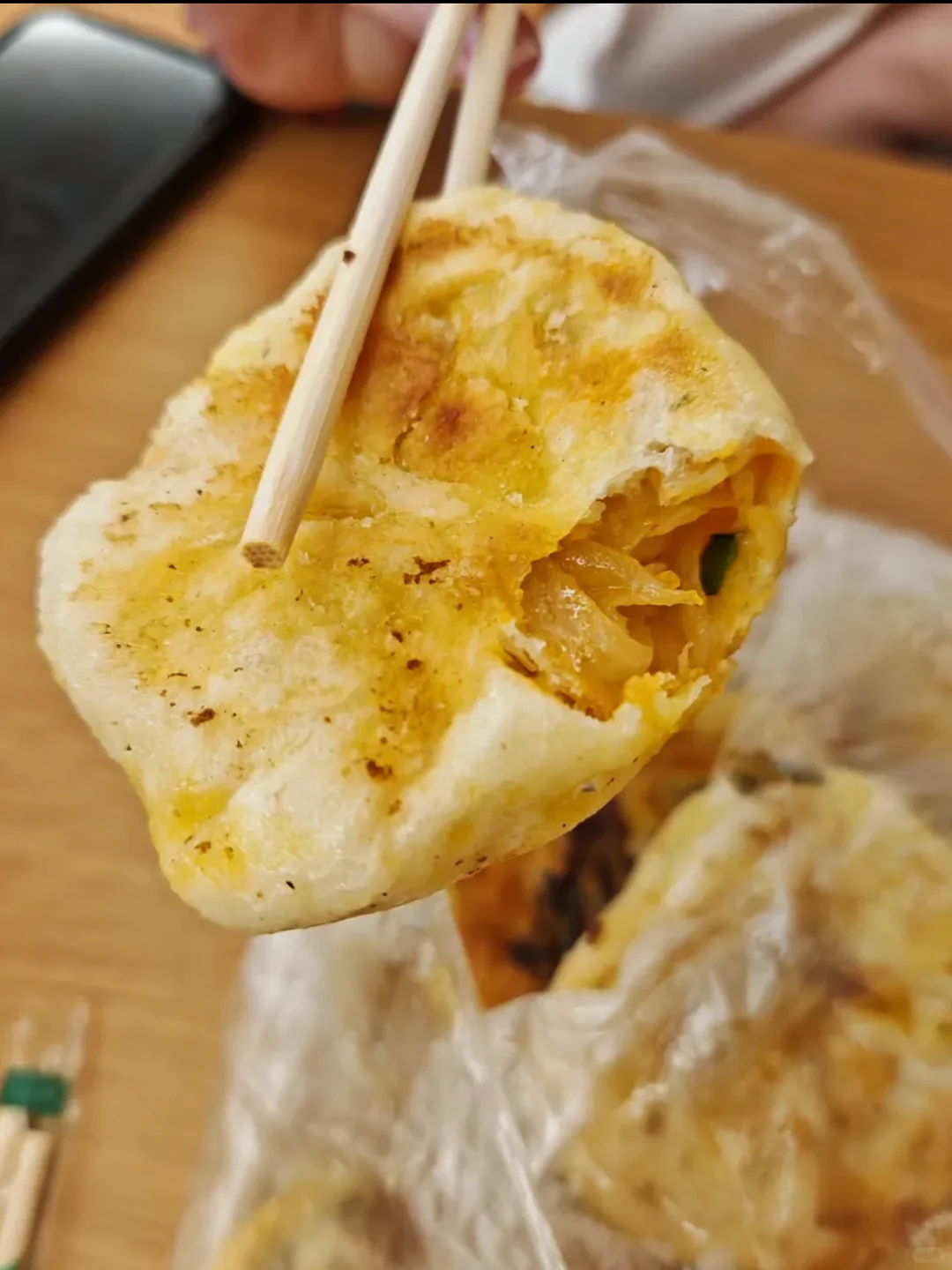 再一口咬下,外酥内软,萝卜丝馅鲜甜多汁,腌制的大白菜也咸香可口。